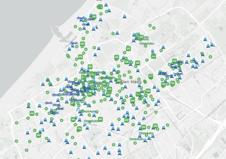 Nee, dit zijn niet de plekken waar je een Haagse snack haalt! Hierboven zie je de kaart met deelauto’s van Greenwheels, Mywheels, Snappcar, OnzeAuto en DEEL. Best een flinke verzameling, toch?