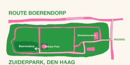 Boerendorp ligt in het Zuiderpark. Om er te komen, neem je de ingang bij de kinderboerderij. Kies het pad links en loop helemaal door naar achteren.