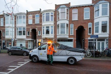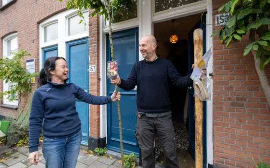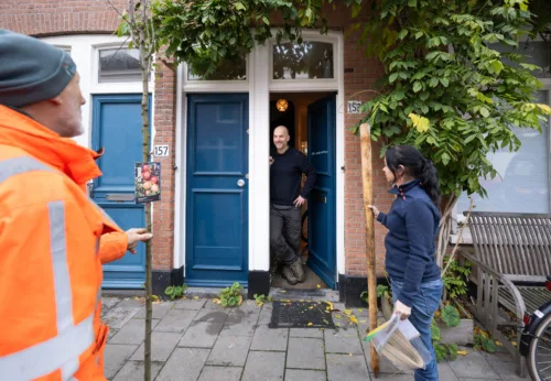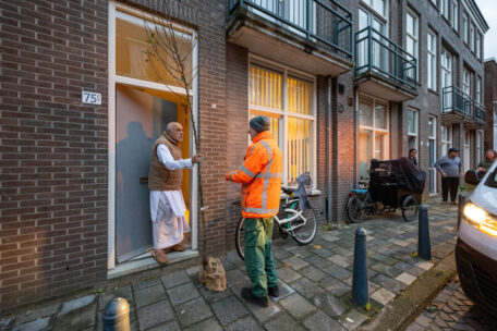 Een van de buurten waar veel bomen zijn aangevraagd is het Regentessekwartier. Willem en Heleen van het Haagse Groenbedrijf delen daar de gratis bomen uit. In alle vroegte rijden ze de wijk door. In hun vrachtauto liggen tientallen bomen, zakken tuinaarde en palen om de boom mee vast te zetten. En natuurlijk een A4 met plantinstructies.