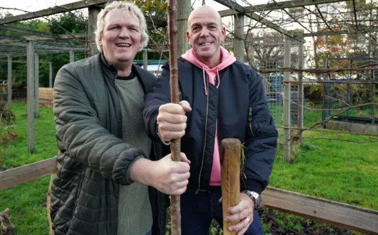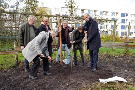 Wethouder Anne Bruins en Joris Wijsmuller planten bomen bij Buurttuin Moerwijk