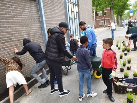 Daarna hebben ze met kruiwagens grond naar de tuintjes gebracht. De kinderen vonden dit geweldig. “Mag ik nog een keer met de kruiwagen racen?” Duurzaam Den Haag leverde de planten en zorgde voor de afvoer van stenen.