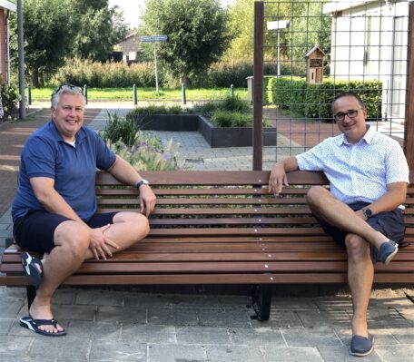 Wilco legt het eindplan voor aan groenbeheerder Albert. “Wij toetsen of het ontwerp, materiaal- en beplantingskeuze akkoord is. Dat zag er prima uit. Wij leggen bij akkoord de plantenbakken en bankjes aan en leveren de aarde en planten. De bewoners zetten ze zelf met elkaar in de grond”, legt Albert uit.