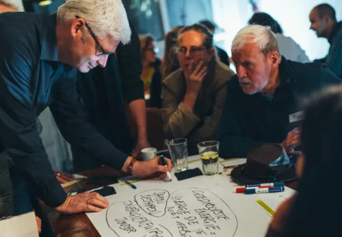 In twee rondes werden aan de negen tafels, onder begeleiding van dialoogbegeleiders, ideeën uitgewisseld, gepitcht en verder uitgewerkt. En dit met veel enthousiasme, humor en applaus voor elkaars ideeën. Enkele concrete ideeën: