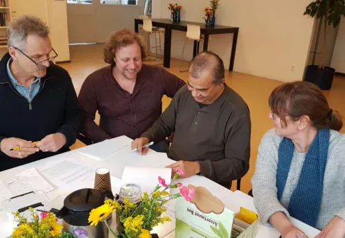 Fotobijschrift: Vlnr. Jan de Jager (Trefpunt Laakhage), Marc Beste (afd. Centraal Vastgoed gemeente Den Haag), Bies Sukul (Trefpunt Laakhage, voorzitter) en Yolanda Brouwer (Trefpunt Laakhage).