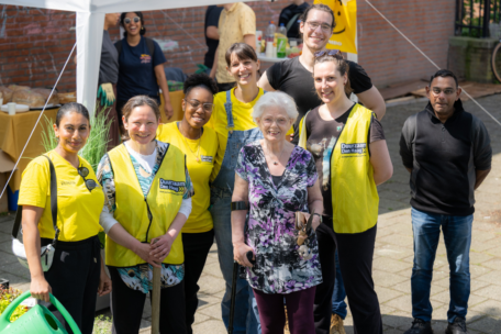 Blije gezichten aan het einde van de geveltuinenactie op de Koningstraat, Wellingtonstraat, Waterloostraat en de Westerbergstraat in Schilderswijk-Noord. De tuintjes zijn er gekomen dankzij initiatief van de 78-jarige straatbewoner Greet. Samen met het buurtteam Ho(e)fkade kijkt ze met voldoening terug op afgelopen zaterdag 18 mei. 'Eindelijk is het groen en mooi hier. Ik blijf tot mijn 100e knokken voor mijn wijk!".