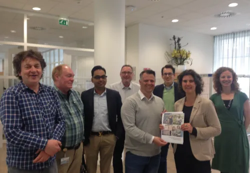 Heleen Weening, directeur van Duurzaam Den Haag, overhandigde vandaag plan De Buurtwerkplaats aan Peter Bos (HSP), Frans Hoijnck van Papendrecht (50Plus), Kavish Partiman (CDA), Michel Rogier (CDA), Dennis Groenewold (D66), Pieter Grinwis (CU) en Christine Teunissen (PvdD), opstellers van het Haags Klimaatpact.