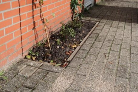 Bewoner Jos van den Brand en een aantal andere buren kregen zo’n drie á vier jaar geleden het idee om de gezamenlijke parkeerplaats achter de huizen te vergroenen. Stenen eruit en gras en planten erin!