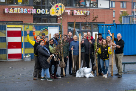 Na een uur aarde scheppen en sjouwen met bomen, kunnen de gaten dicht en kan er water bij de appelbomen, mispels, Japanse witte appelbomen en gele kornoelje. Ook op het groene schoolplein van ‘t Palet is een boom geplant. “Zo wordt onze omgeving steeds een stap groener en prettiger”, zegt directeur José Oliehoek van de basisschool.