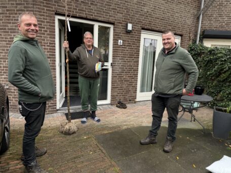 Later die dag krijgen ook de bewoners in Wateringse Veld hun boom met plantinstructies. “Oh hier ben ik blij mee”, zegt André als hij de prunus in handen krijgt. “Ik verheug me op de mooie roze bloesem.” Buurtbewoner Koos krijgt een gele kornoelje. “Ik heb de boom aangevraagd om de tuin meer kleur te geven.”